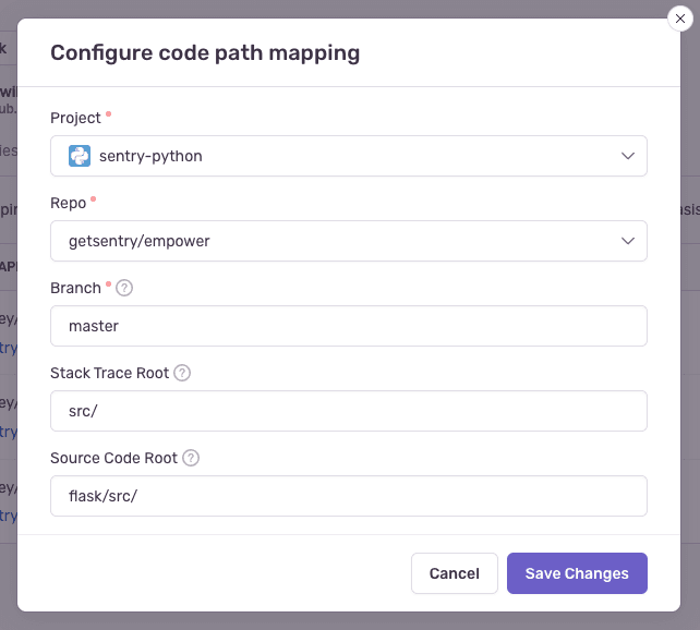 - Repo (required) - The GitHub or GitLab repository associated with the Sentry project above. If you have more than one repository being used per Sentry project, you'll need multiple code mappings.